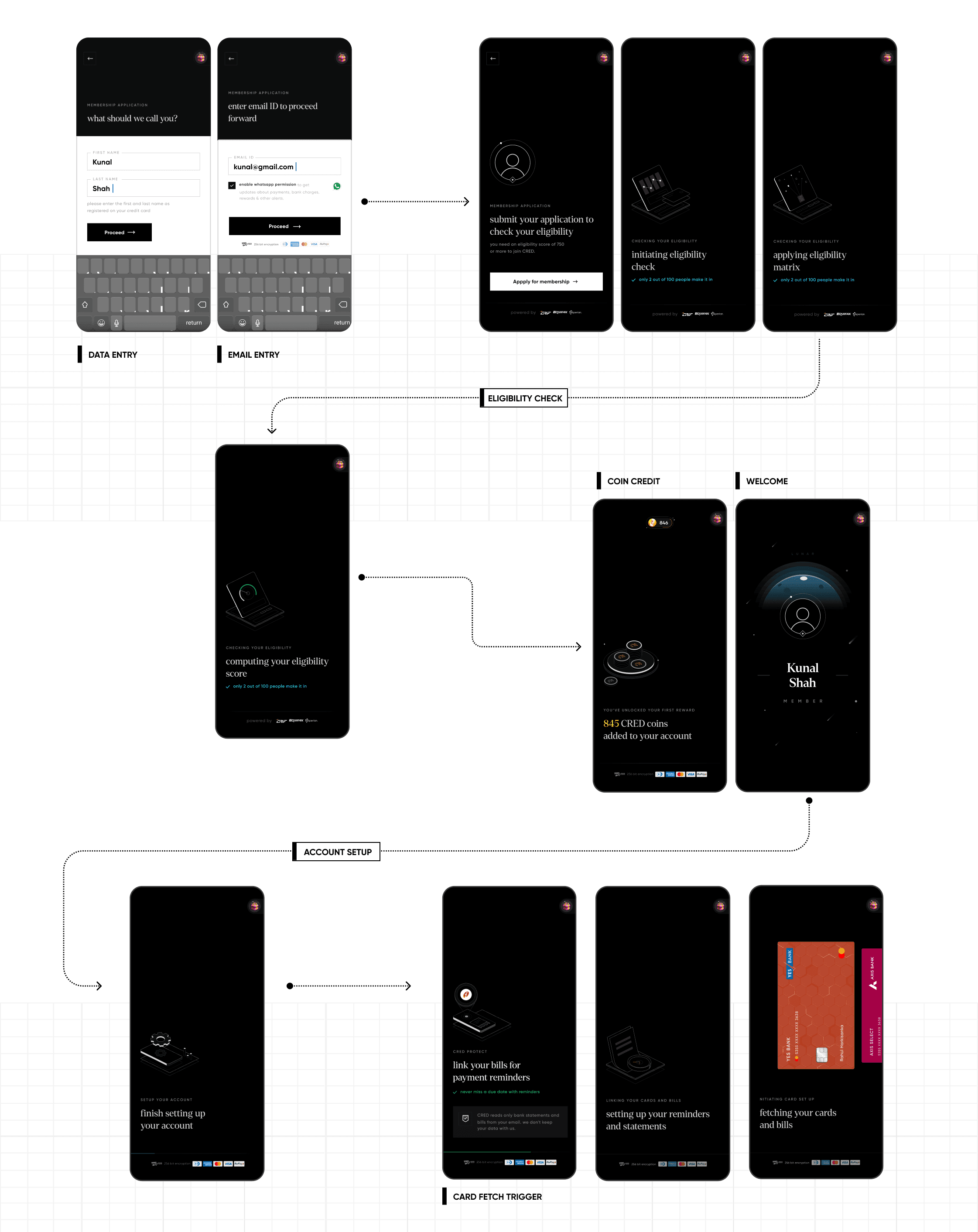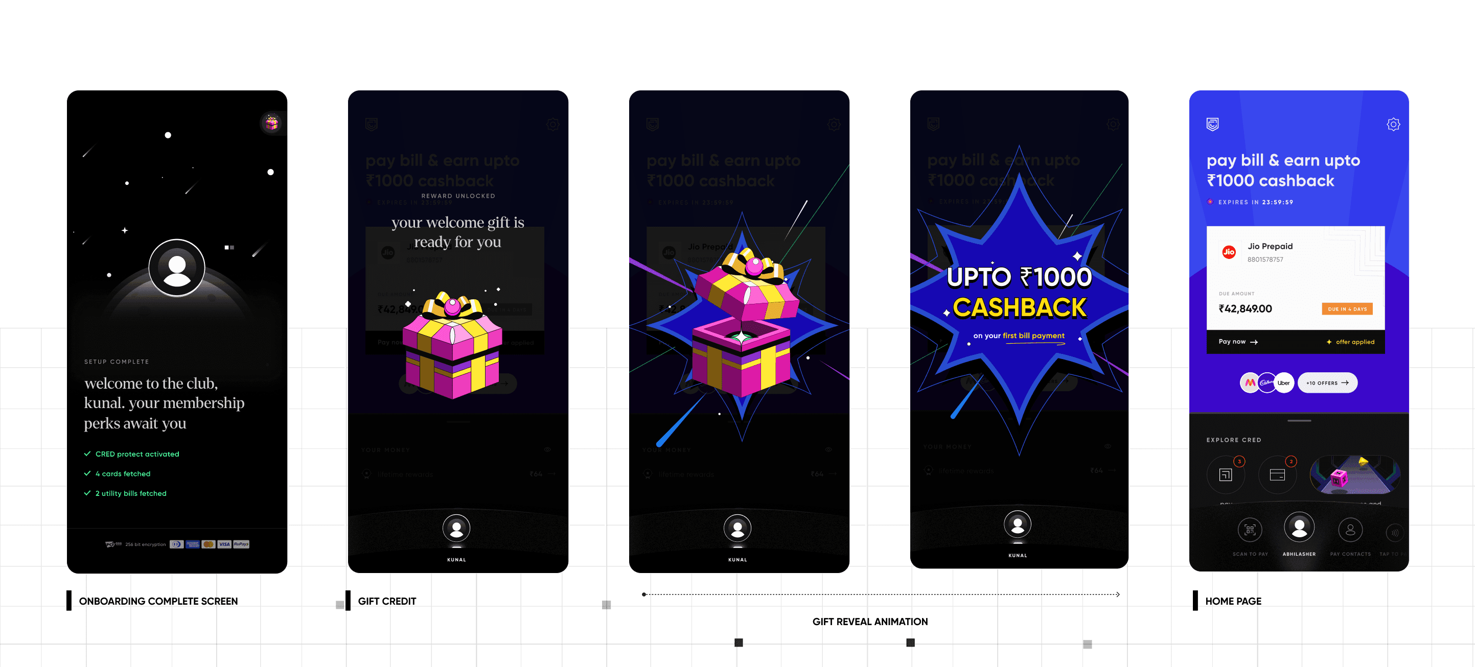 The CRED onboarding flow evolved from a utilitarian process to a delightful experience that effectively communicated the app's core value proposition. As summarized by the designer: "My biggest takeaway was that the number of steps becomes secondary if your flows follow a tight and engaging narrative and delightful presentation on top with it."