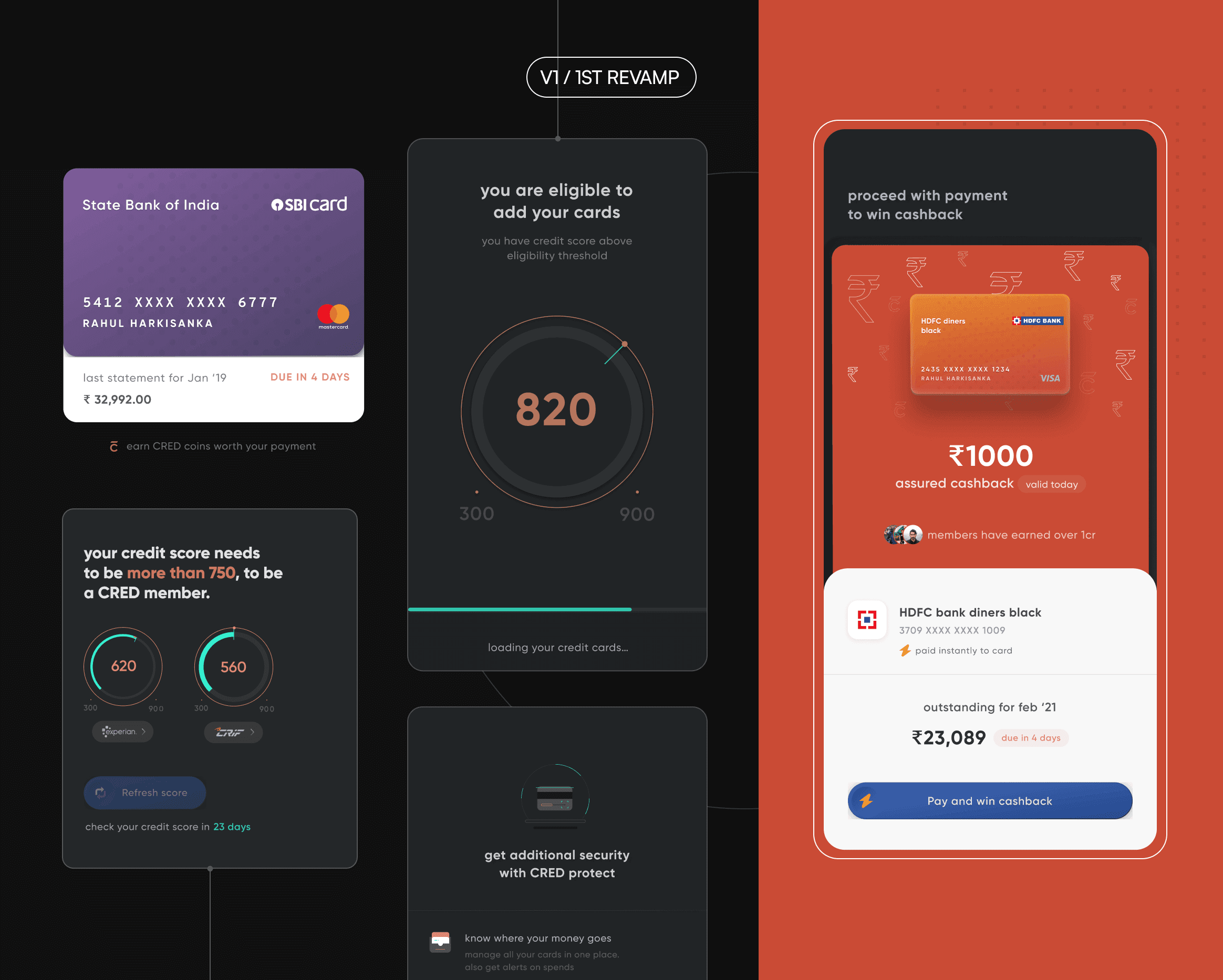 CRED's 2021 design evolution focused on expanding the design system without complete architectural overhaul. The team reskinned the flow to the new style, prioritizing the Payment Intercept screen.